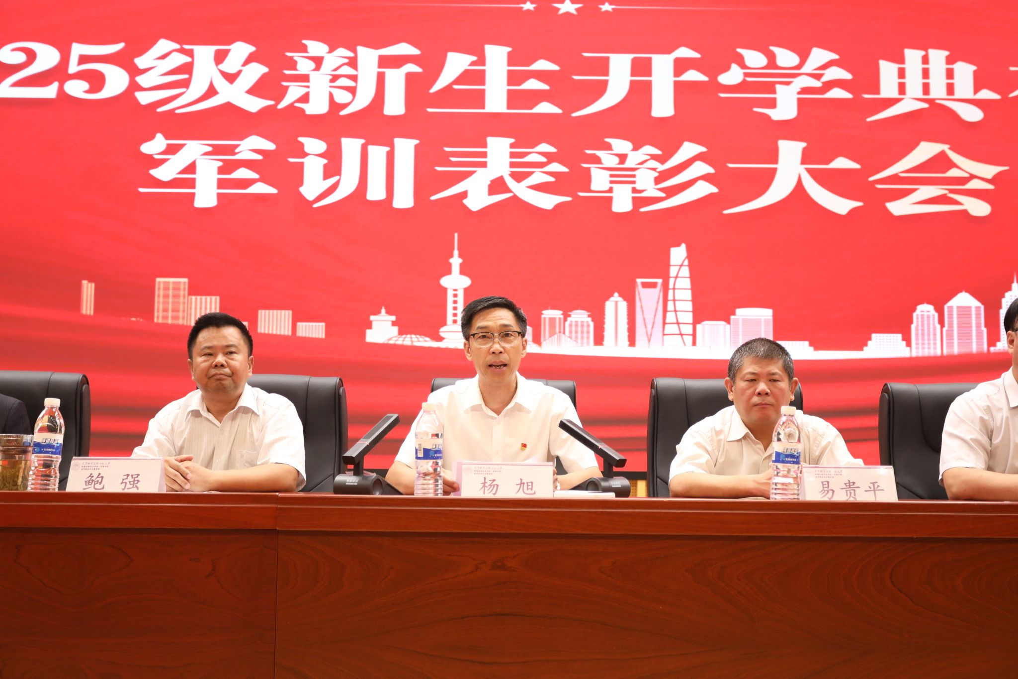 杨旭代表全校师生员工向顺利完成军训任务、正式开启求学新征程的2025级全体新同学提出了四点期望:一是铭记校训“立德修身,笃学强技”,筑牢成长根基。二是融入校风“求真务实,尚德尚能”,营造优良氛围。三是感受教风“有教无类,包容至善”,珍惜学习机遇。四是践行学风“尊师重道,自强有恒”,书写奋斗华章。希望全体同学发扬军训中培养出的顽强拼搏精神,树立远大志向,保持坚韧不拔的毅力,不断超越自我,实现人生的价值。