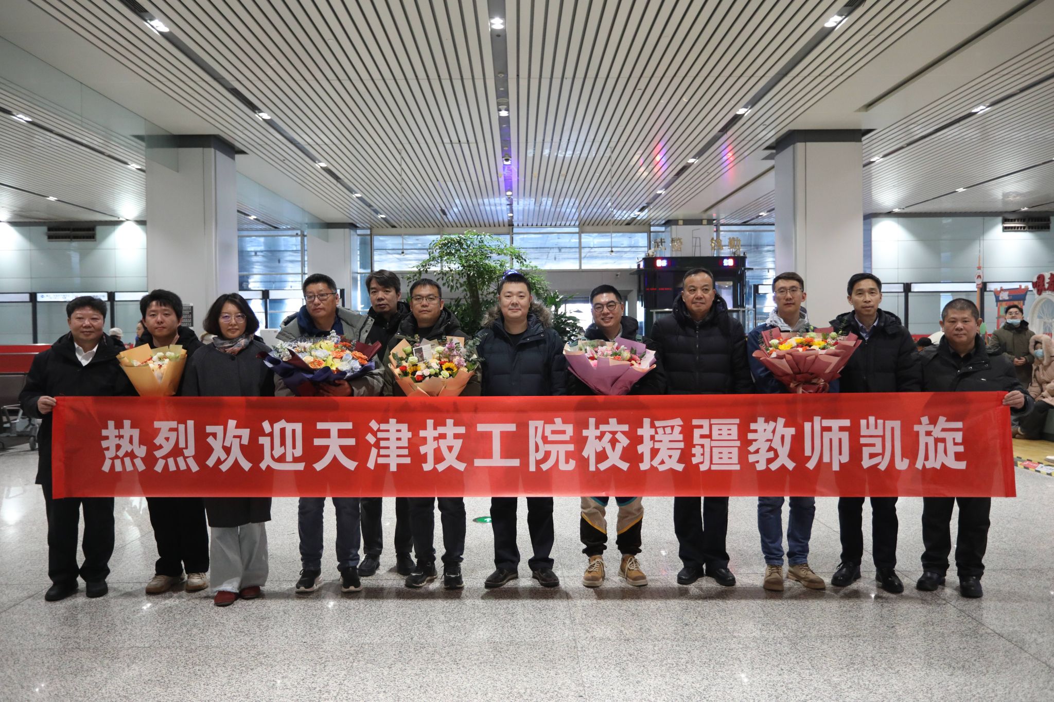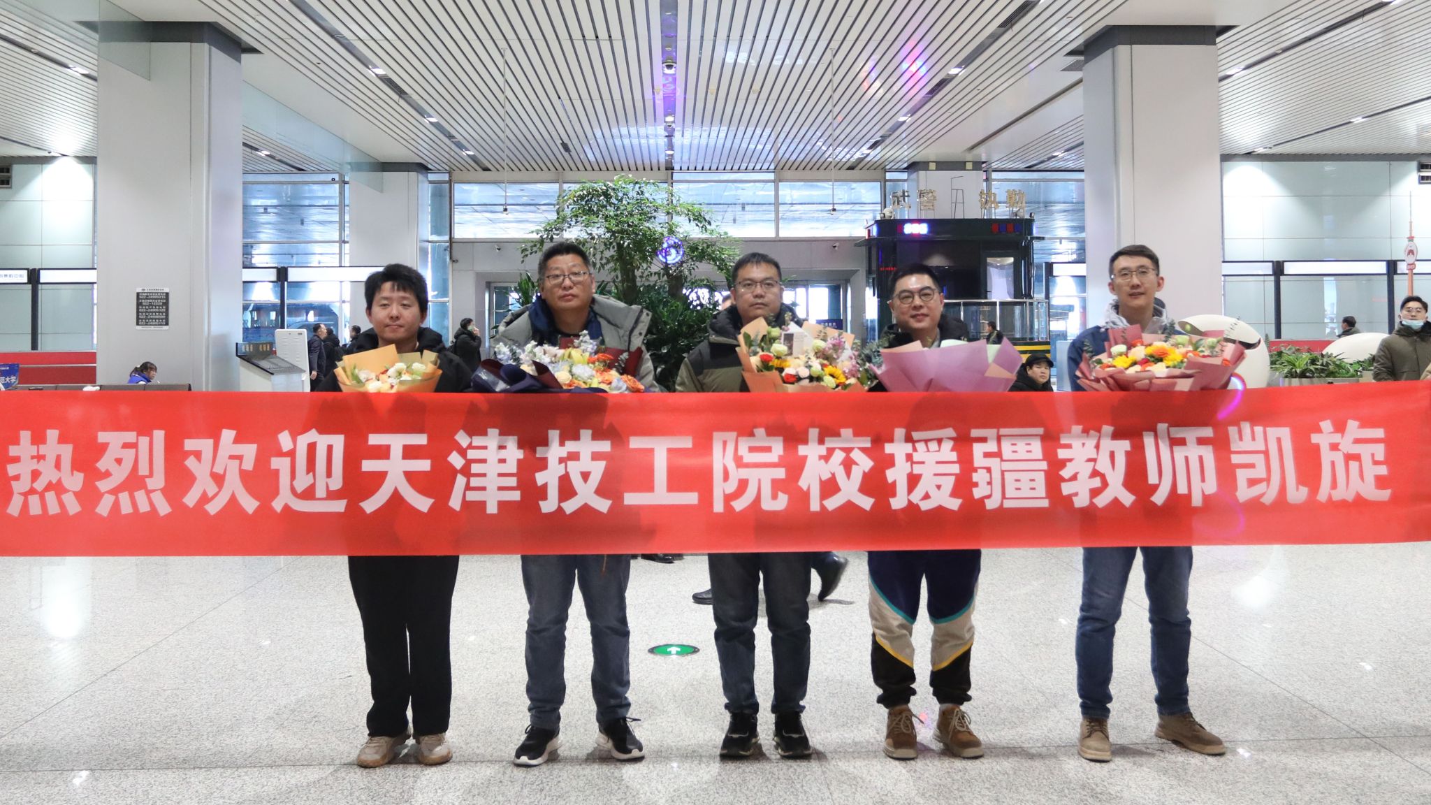 1月21日下午,天津市第二批赴新疆和田地区开展支教工作的5名技工院校教师,圆满完成为期一年半的援疆任务,平安返回天津。天津职业技术师范大学附属高级技术学校(以下简称我校)高级实习指导教师、天津市技术能手徐洋作为该批次援疆教师团队成员随队归来。市人社局相关处室负责同志、我校党委书记杨旭、校长易贵平前往天津滨海国际机场迎接,向在戈壁深处奉献教育情怀的“工匠之师”们致以诚挚问候和崇高敬意。